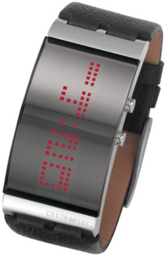 With red scrolling LED numbers that display the time and date, the Diesel Men's Black SBA Scrolling LED Digital Black Dial Watch pushes the envelope of avant-garde style. The LED numbers are displayed on a rectangular dial that is mirrored with electroplating. The LED display lights up and begins to scroll when the button is pushed. The LED module can display other messages, too, and is programmable up to 20 characters. The dial is protected by a mineral crystal and backed by a stainless steel case. Keeping all of this securely on your wrist is a black leather strap that closes with a hook buckle. Other features include quartz movement and water-resistance to 165 feet (50 meters)."See More Feature and Reviews"